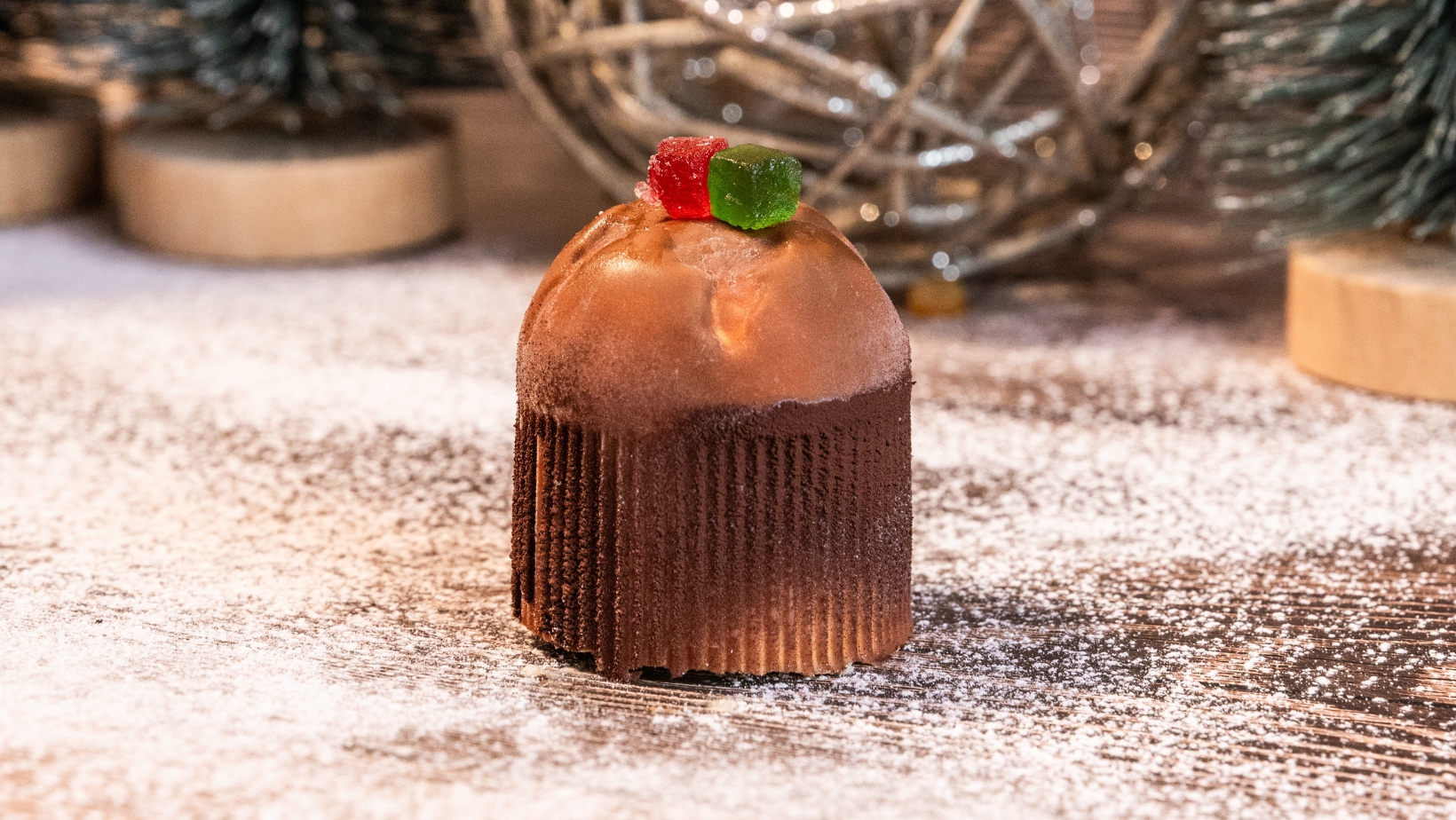 Il Panettoncino è poi ricoperto da una lucente glassatura al cioccolato, perfettamente bilanciata, e decorato con due canditi esterni, che aggiungono un tocco di colore e richiamano le tradizioni natalizie. È il dessert perfetto per chi cerca la raffinatezza e l’originalità.